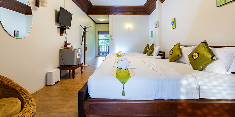 ห้องพักที่มีขนาด 45 ตรม. มีทัศนียภาพและตกแต่งให้มีสิ่งอำนวยความสะดวกครบครัน อยู่ชั้นสอง มองเห็นสระว่ายน้ำ พักได้ 4 ท่าน มี 2 ห้อง มี 2 เตียงใหญ่ มี 1 ห้องน้ำ อ่างอาบน้ำ และระเบียงนั่งเล่นหลังห้อง